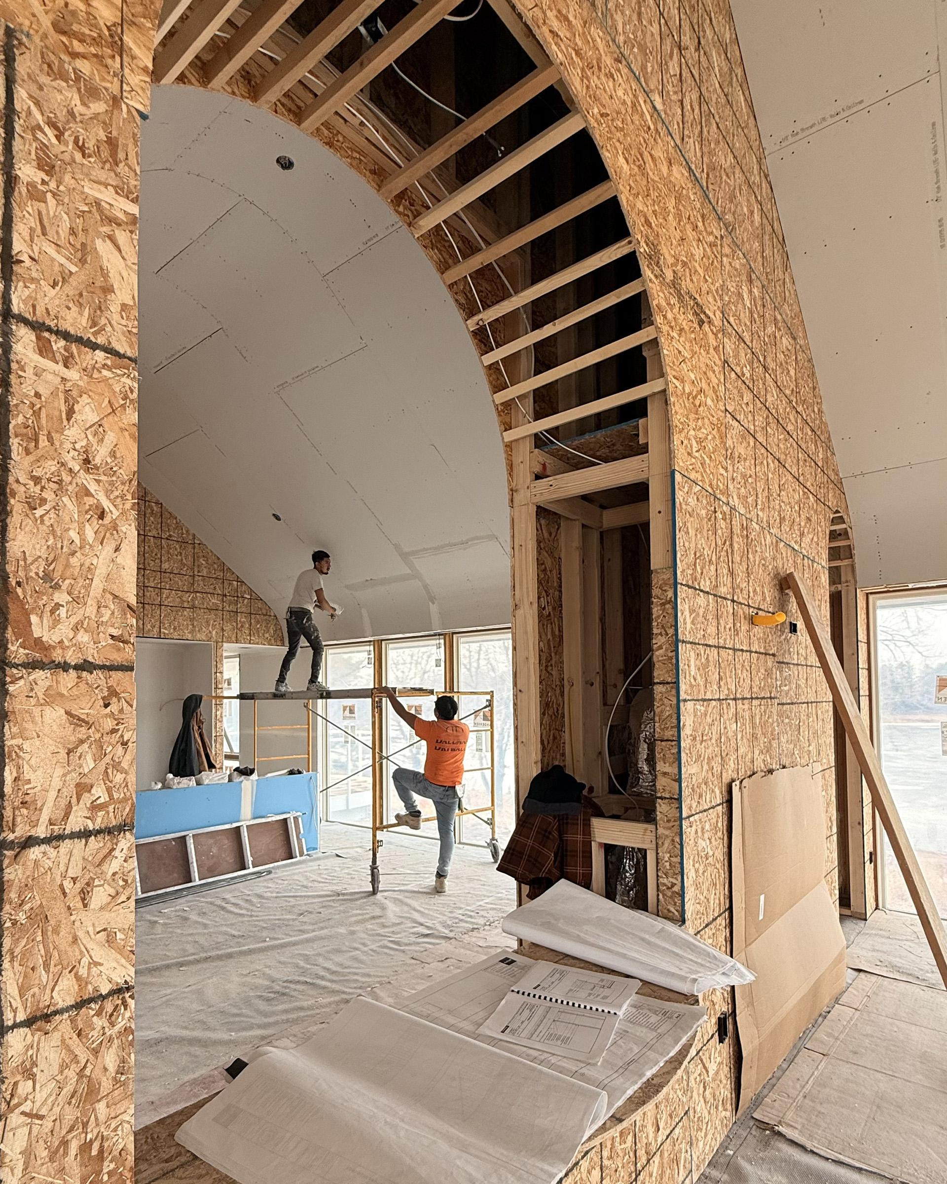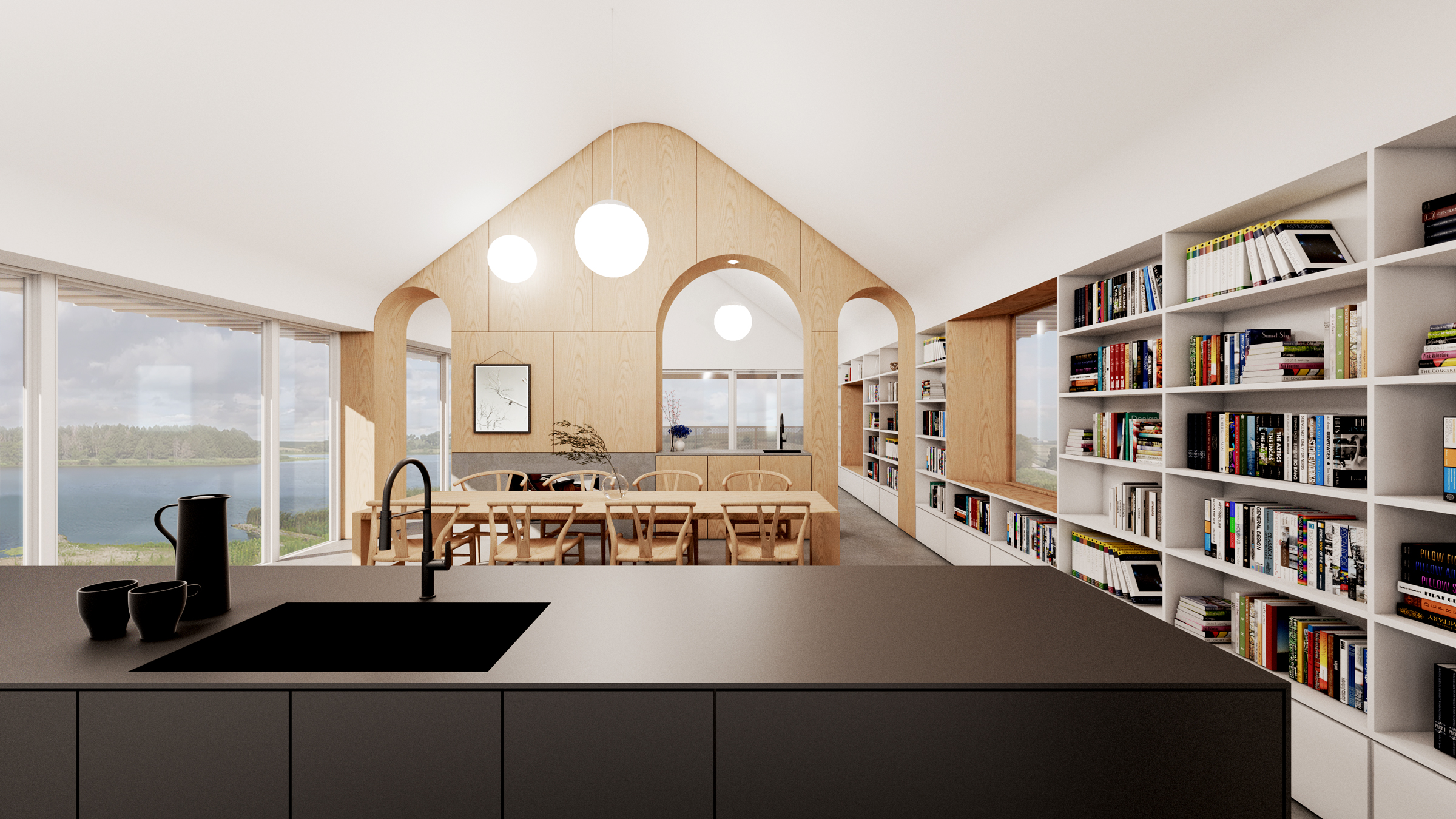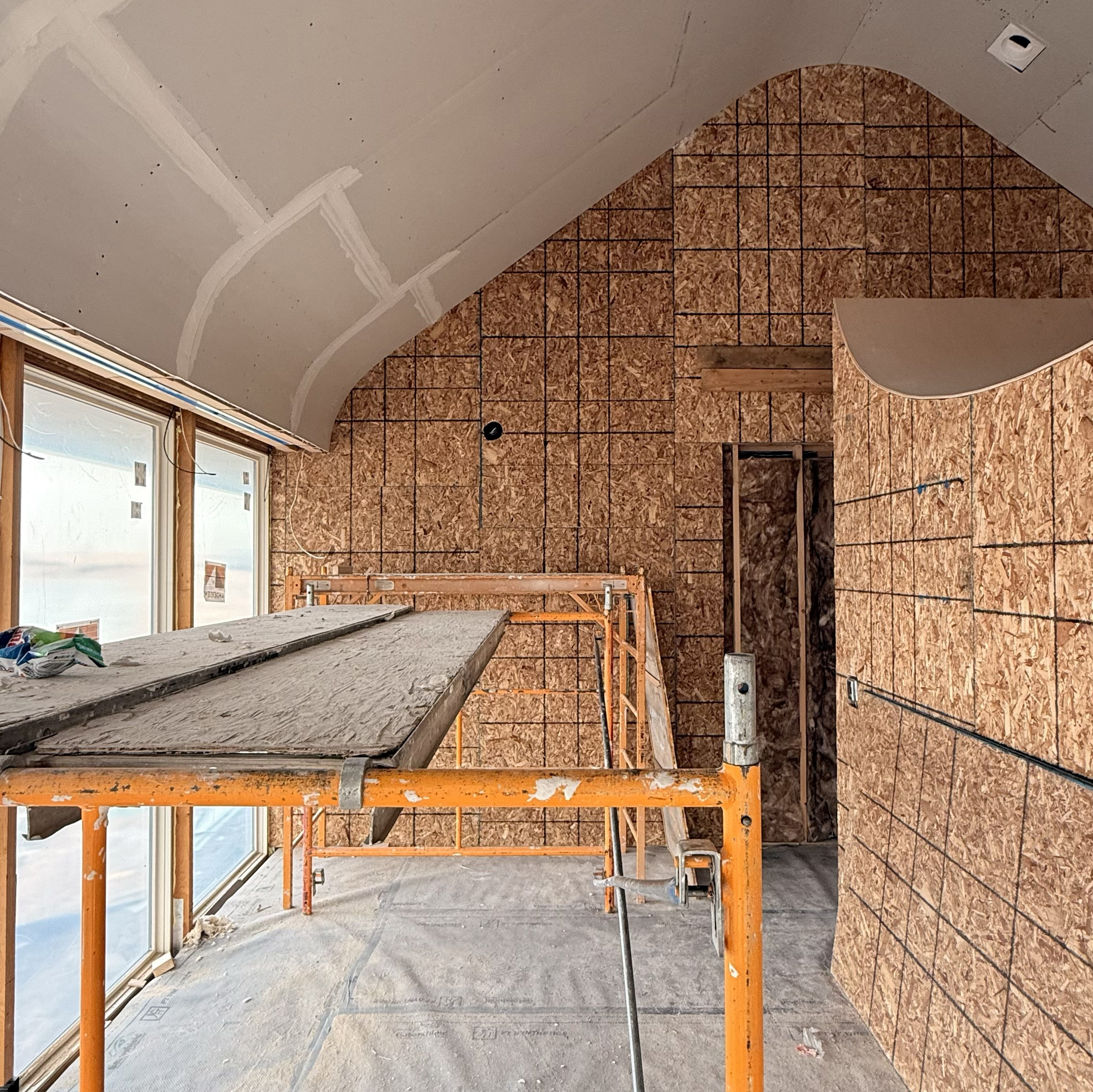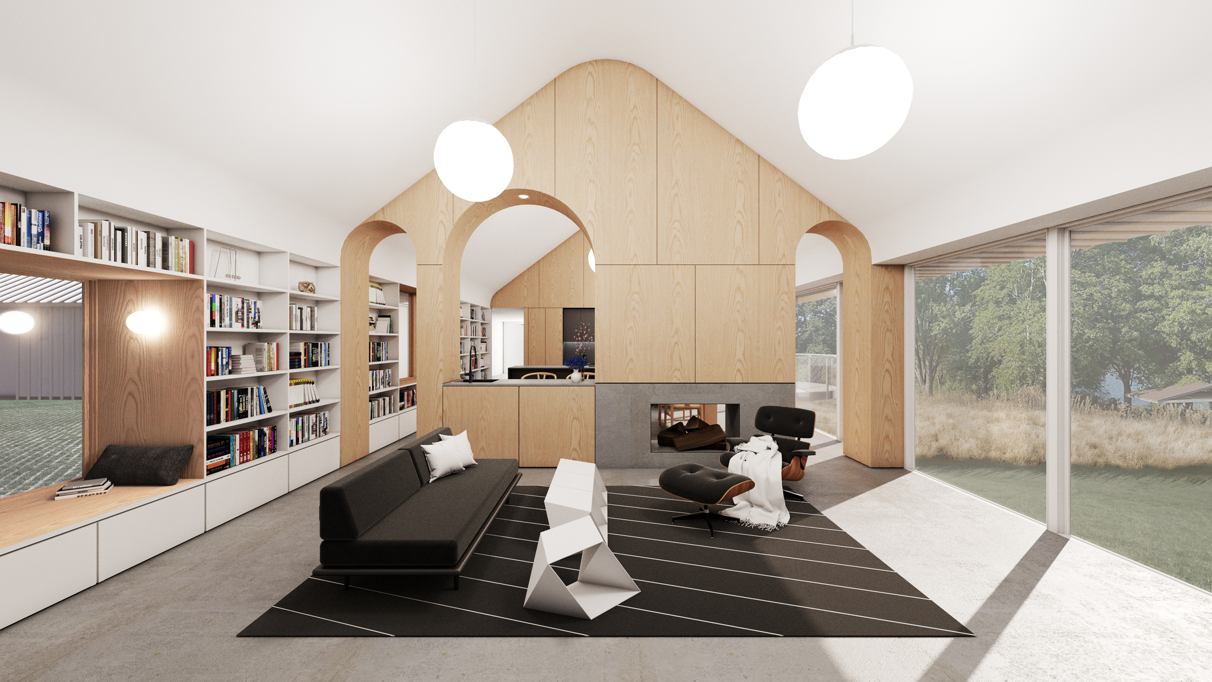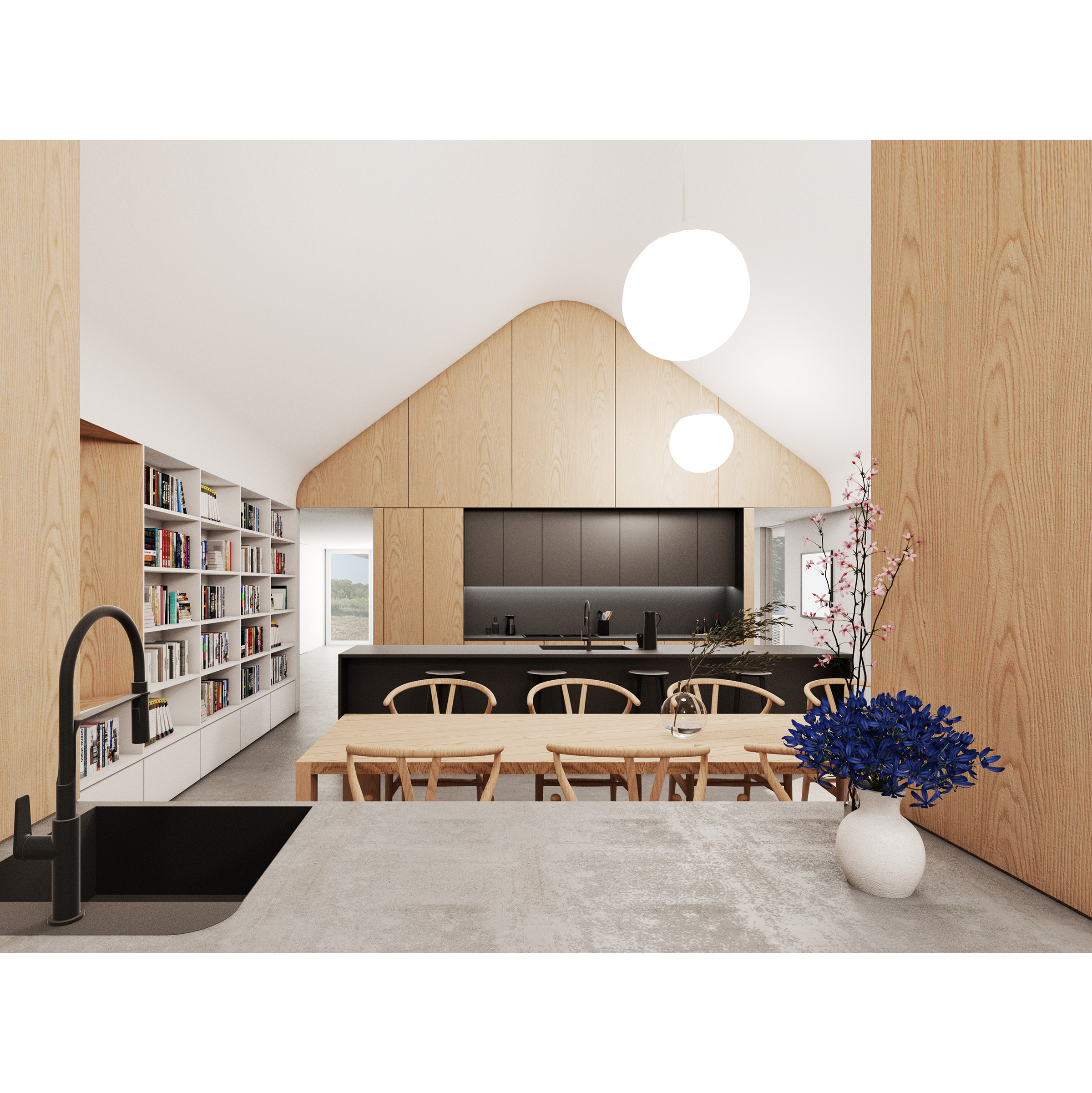 Where the exterior is monolithic in color and form, the interior of the house is a reverse hierarchy of texture, material, and color. The large social and multifunctional spaces, as well as the primary bedroom have simple white surfaces with vaulted, curved ceilings, hidden cabinetry, and plywood clad end walls and dividers. Bright color or matte black highlights secondary spaces such as the stair as counterpoints to the overall logic of the house. Floors are ground, polished concrete.
