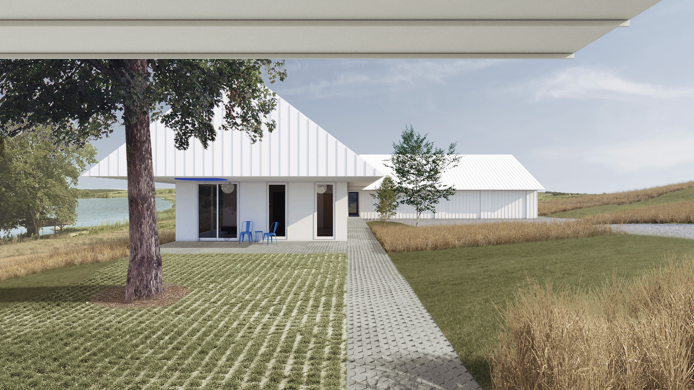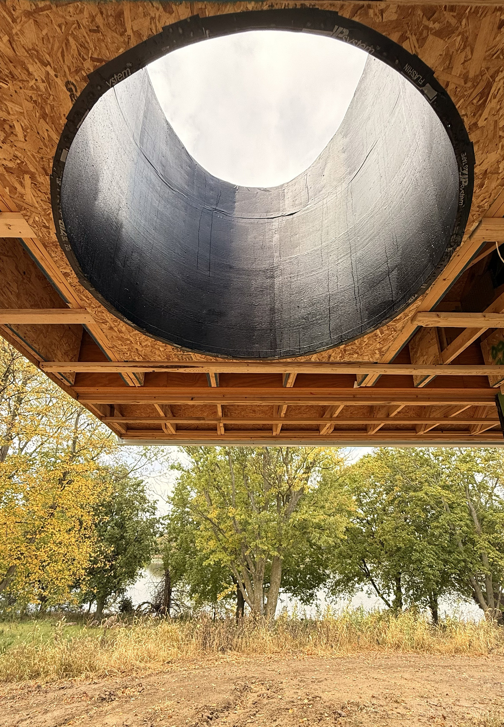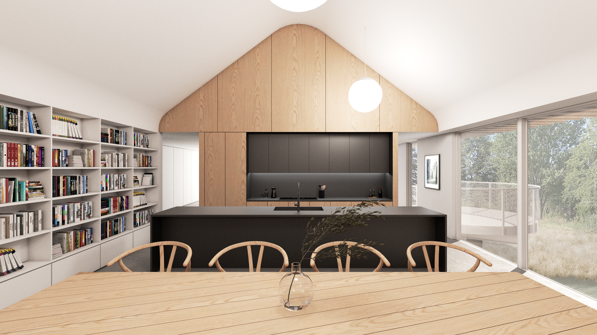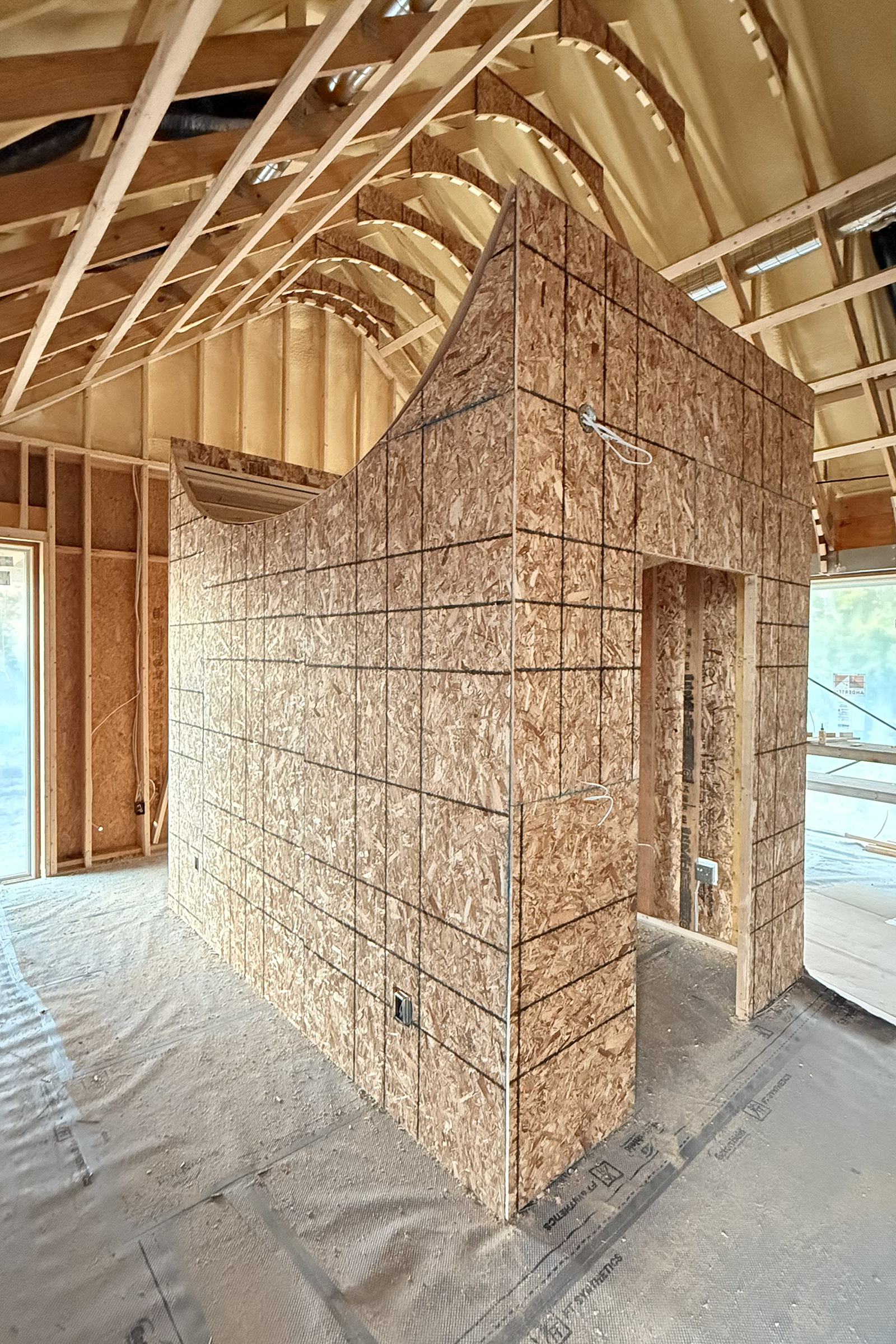 Where the exterior is monolithic in color and form, the interior of the house is a reverse hierarchy of texture, material, and color. The large social and multifunctional spaces, as well as the primary bedroom have simple white surfaces with vaulted, curved ceilings, hidden cabinetry, and plywood clad end walls and dividers. Bright color or matte black highlights secondary spaces such as the stair as counterpoints to the overall logic of the house. Floors are ground, polished concrete.
