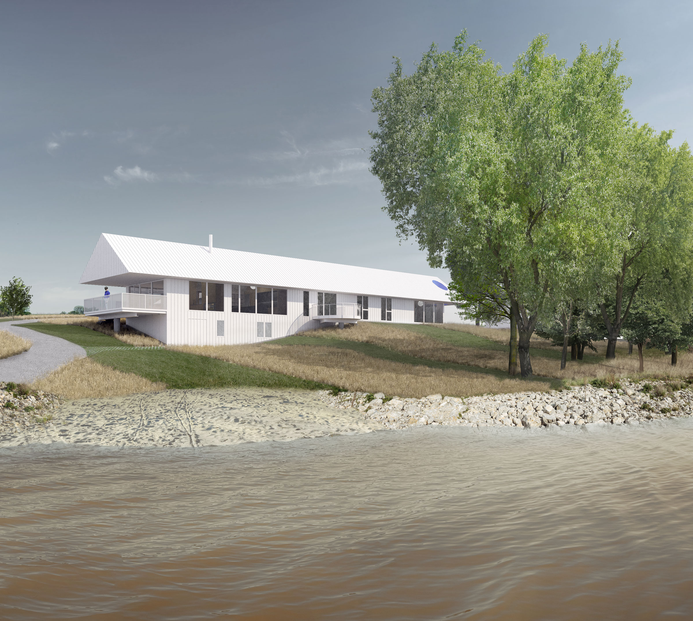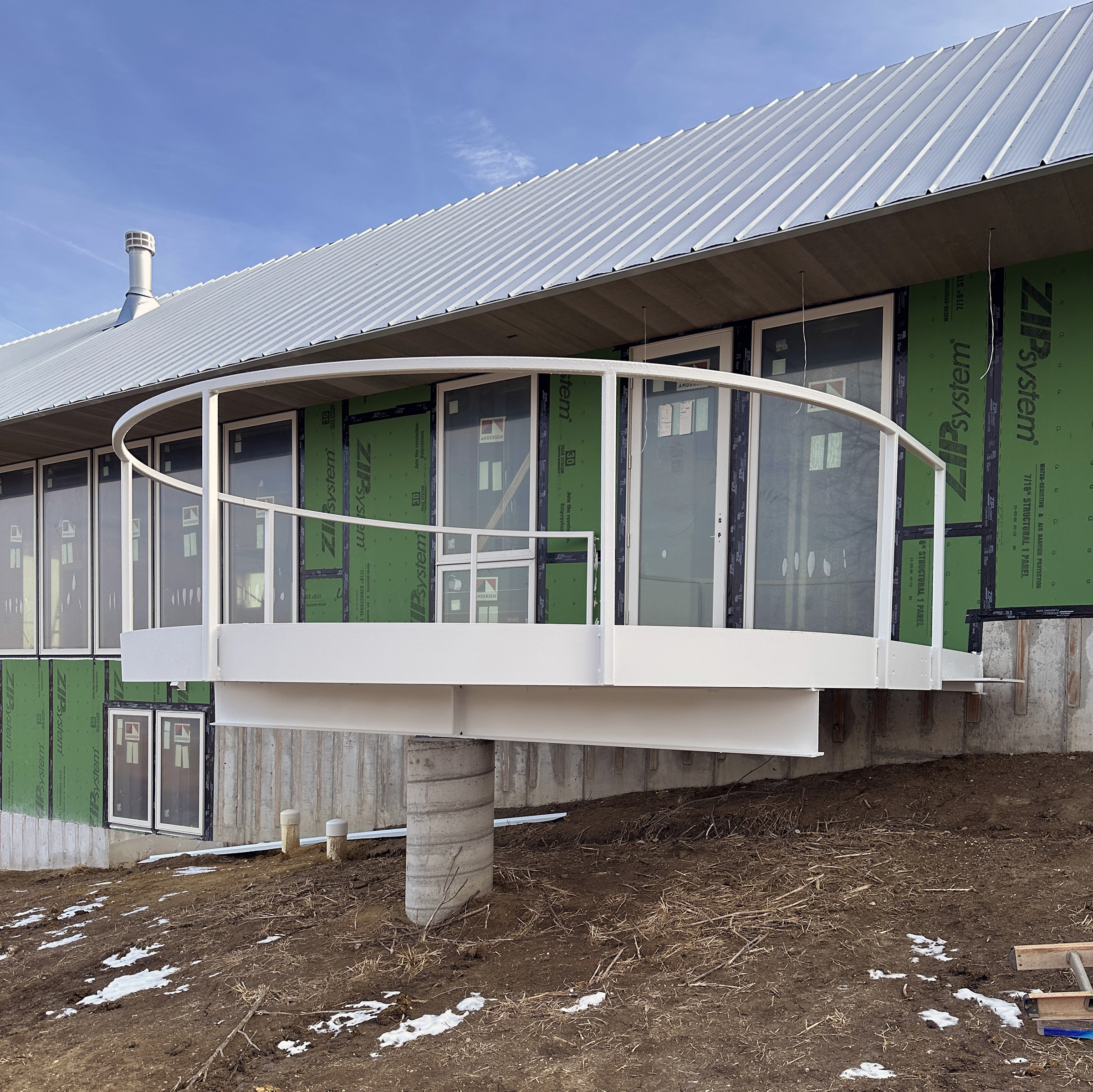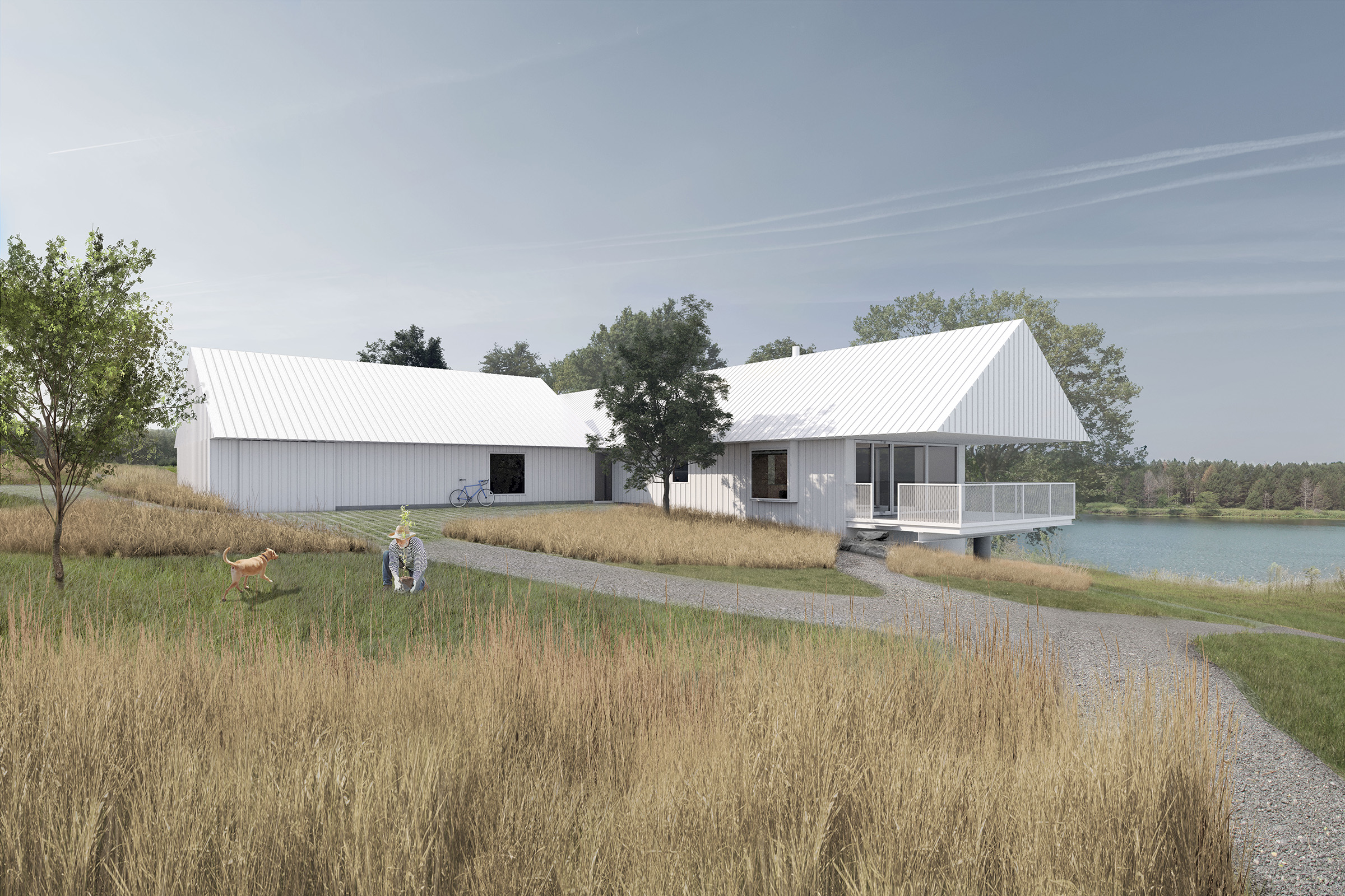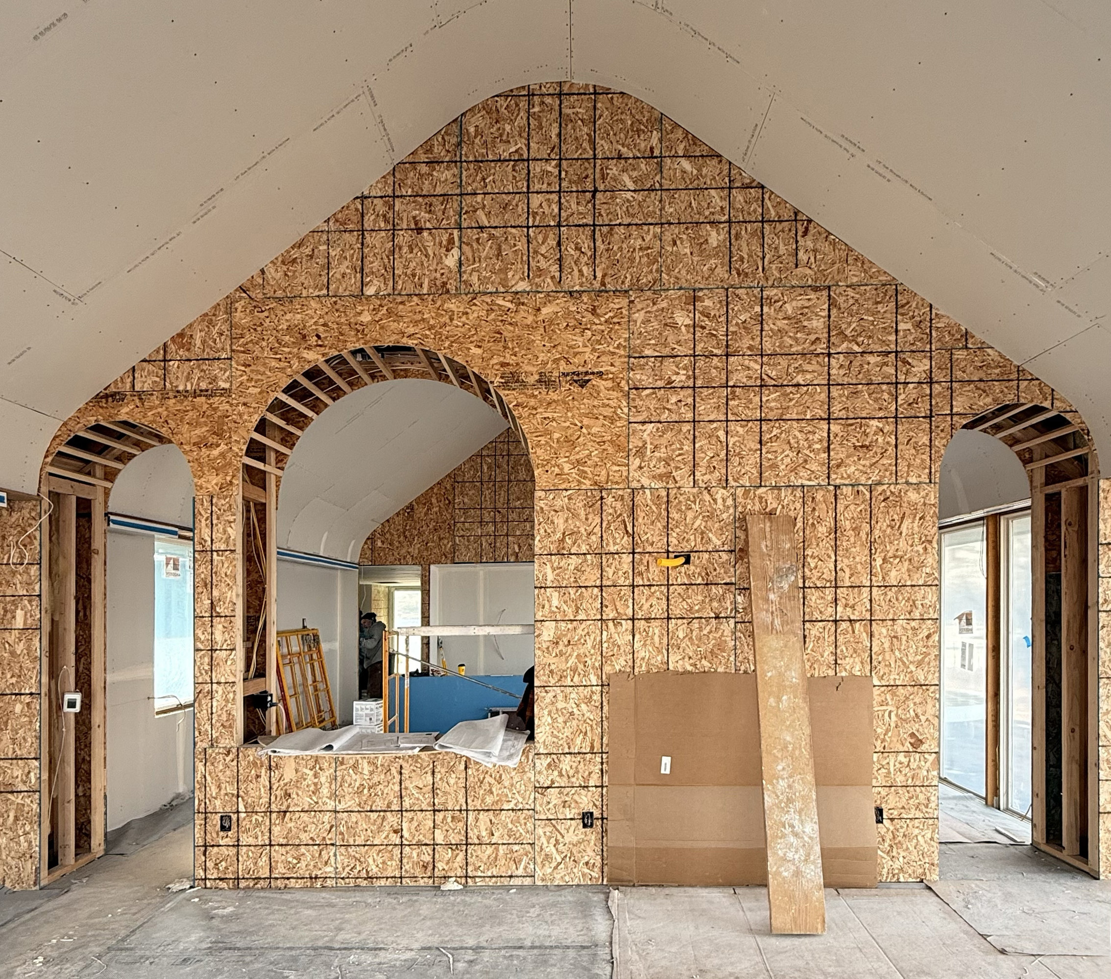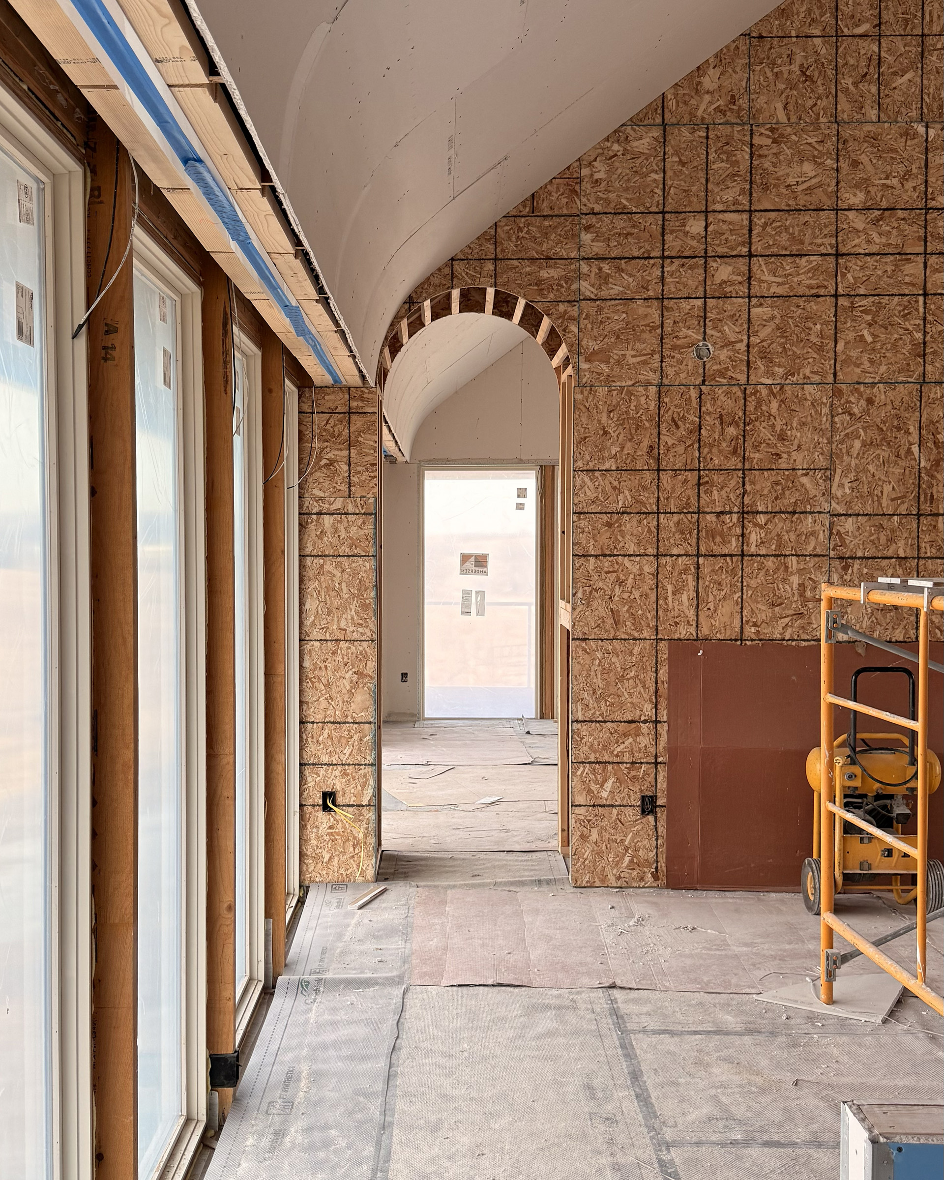Where the exterior is monolithic in color and form, the interior of the house is a reverse hierarchy of texture, material, and color. The large social and multifunctional spaces, as well as the primary bedroom have simple white surfaces with vaulted, curved ceilings, hidden cabinetry, and plywood clad end walls and dividers. Bright color or matte black highlights secondary spaces such as the stair as counterpoints to the overall logic of the house. Floors are ground, polished concrete.