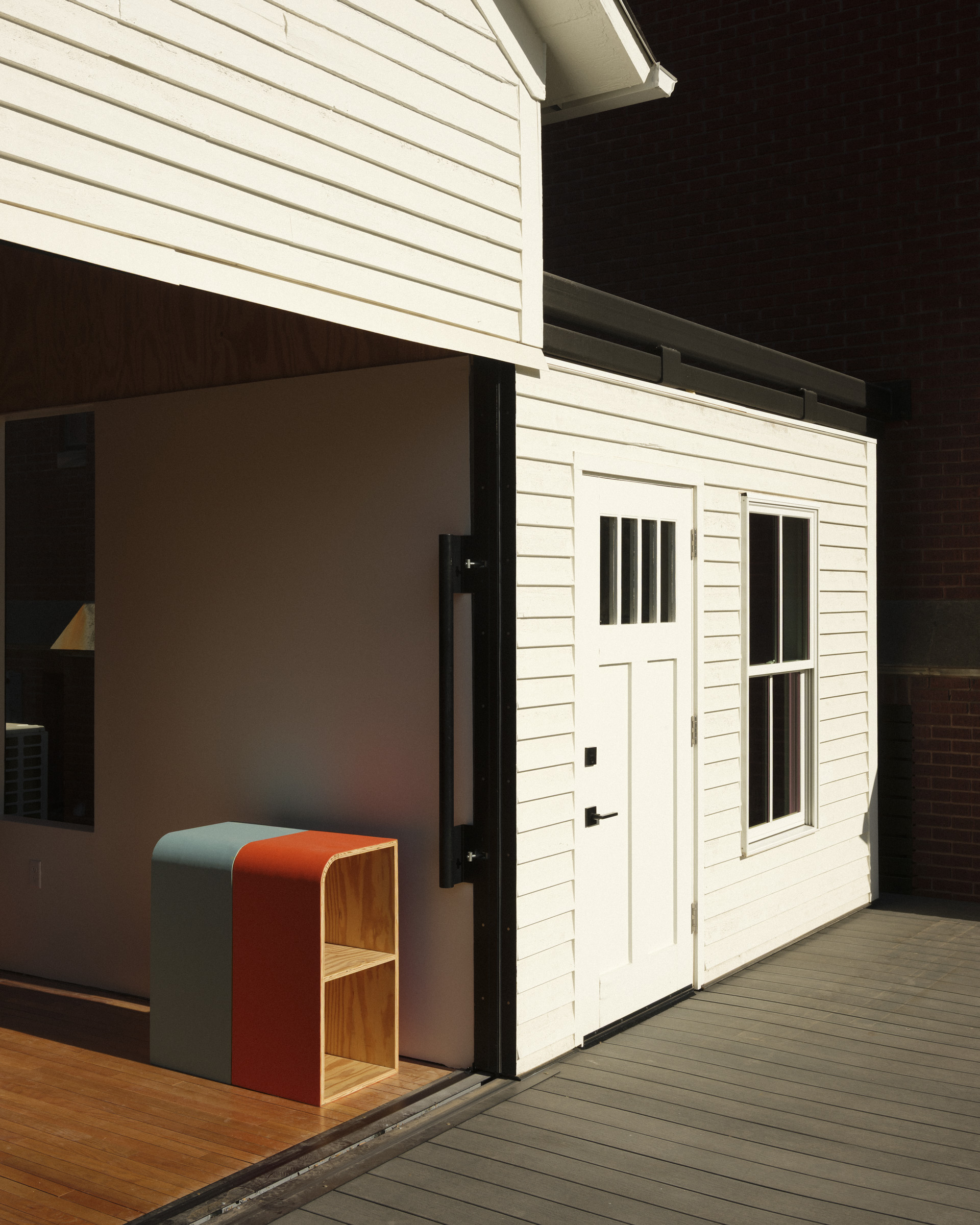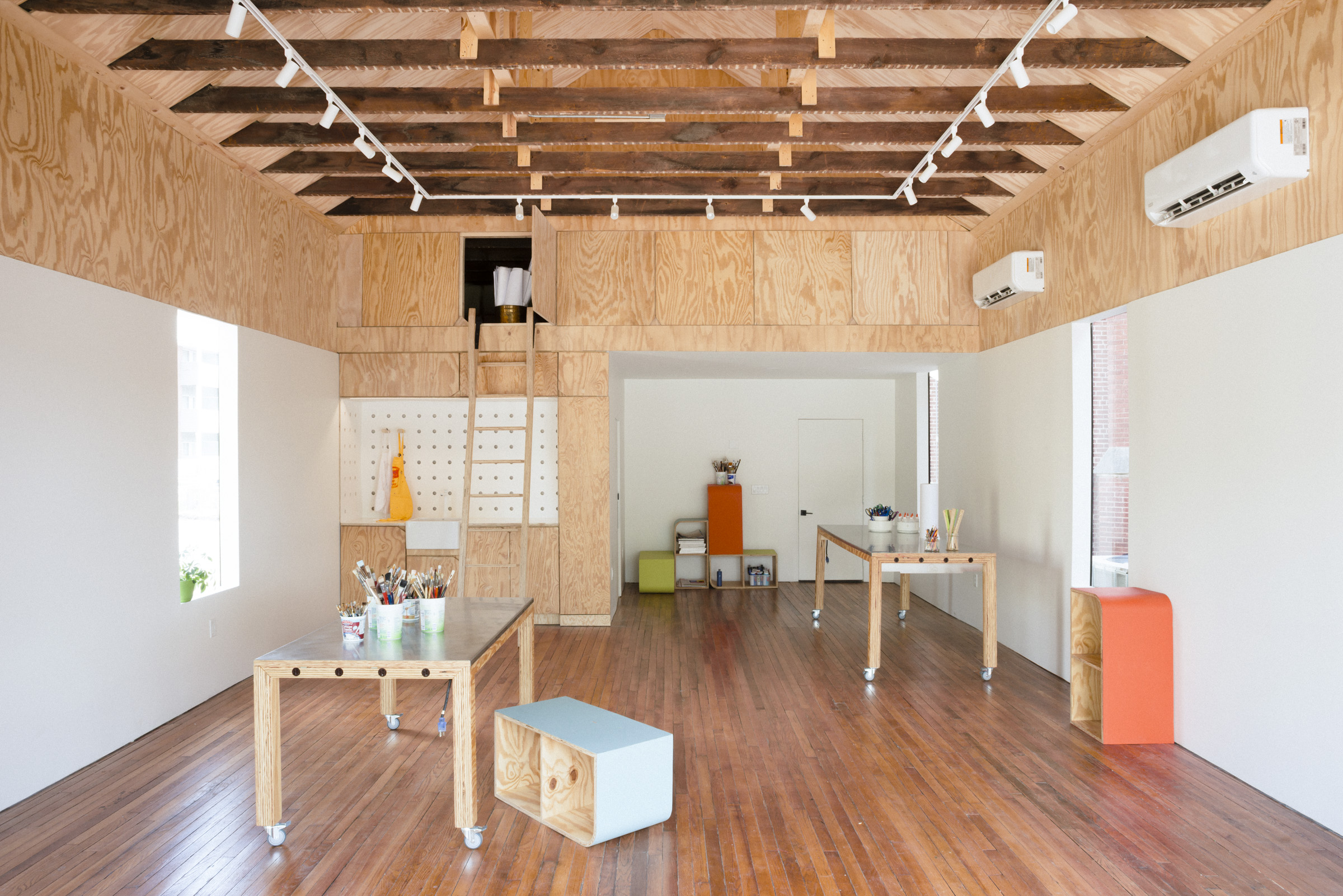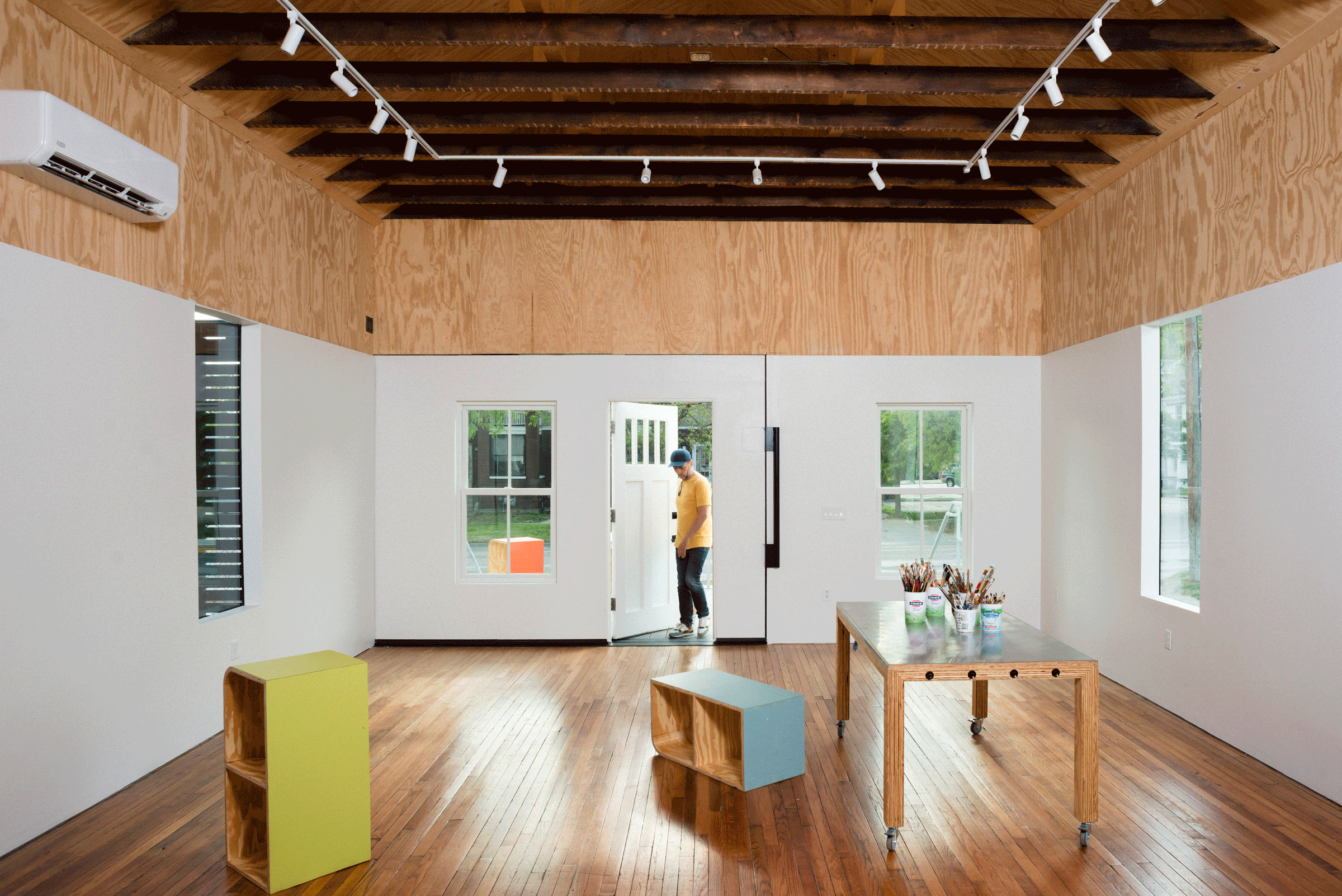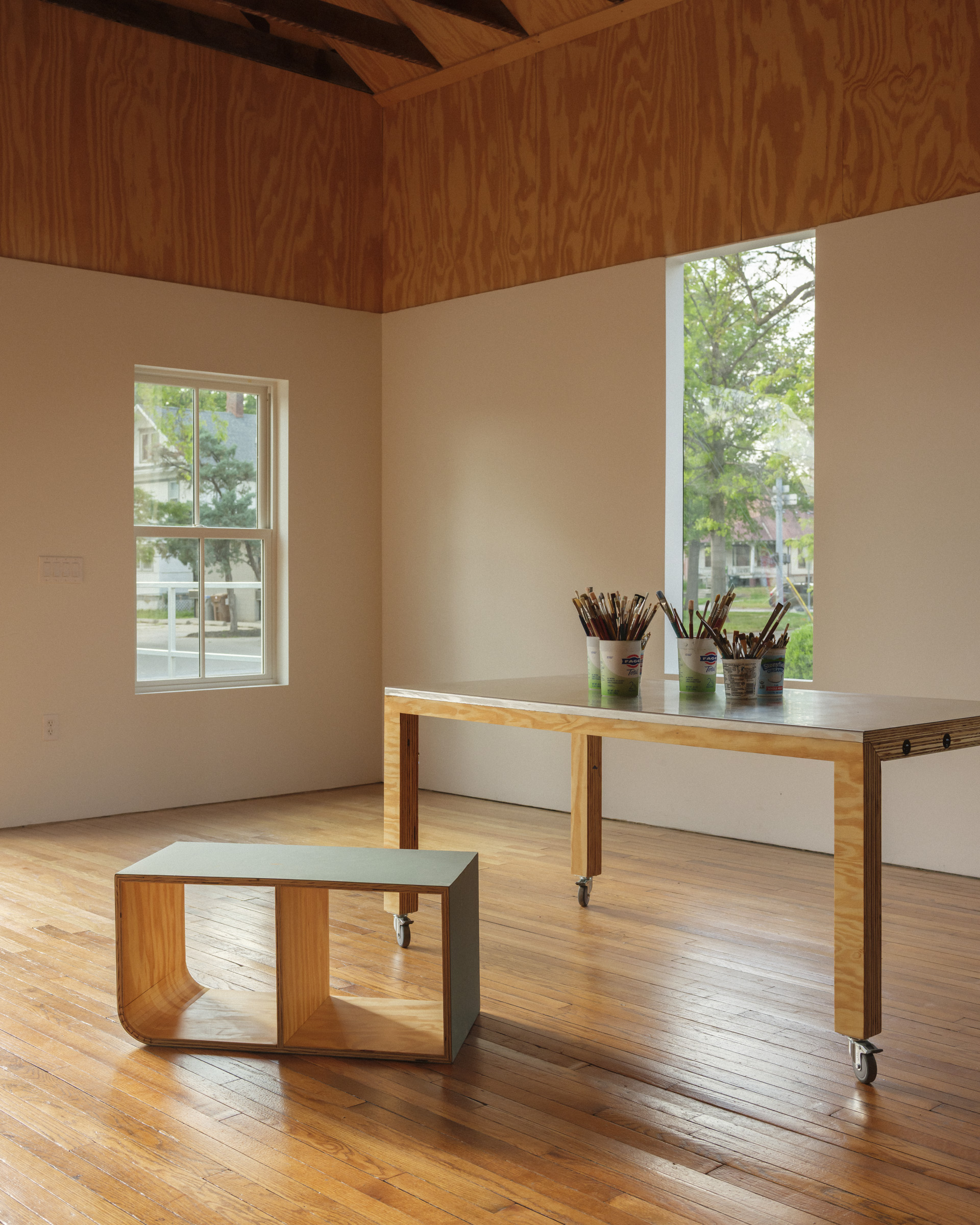 The most distinctive new feature is a large rolling wall that opens the Art Chapel to the community both literally and figuratively. The rolling wall is cut from the existing exterior wall preserving a door and window. The main interior space is a multi use room for art classes and exhibitions. At the back of this room is a new plywood wall that repeats the form of the open street elevation.