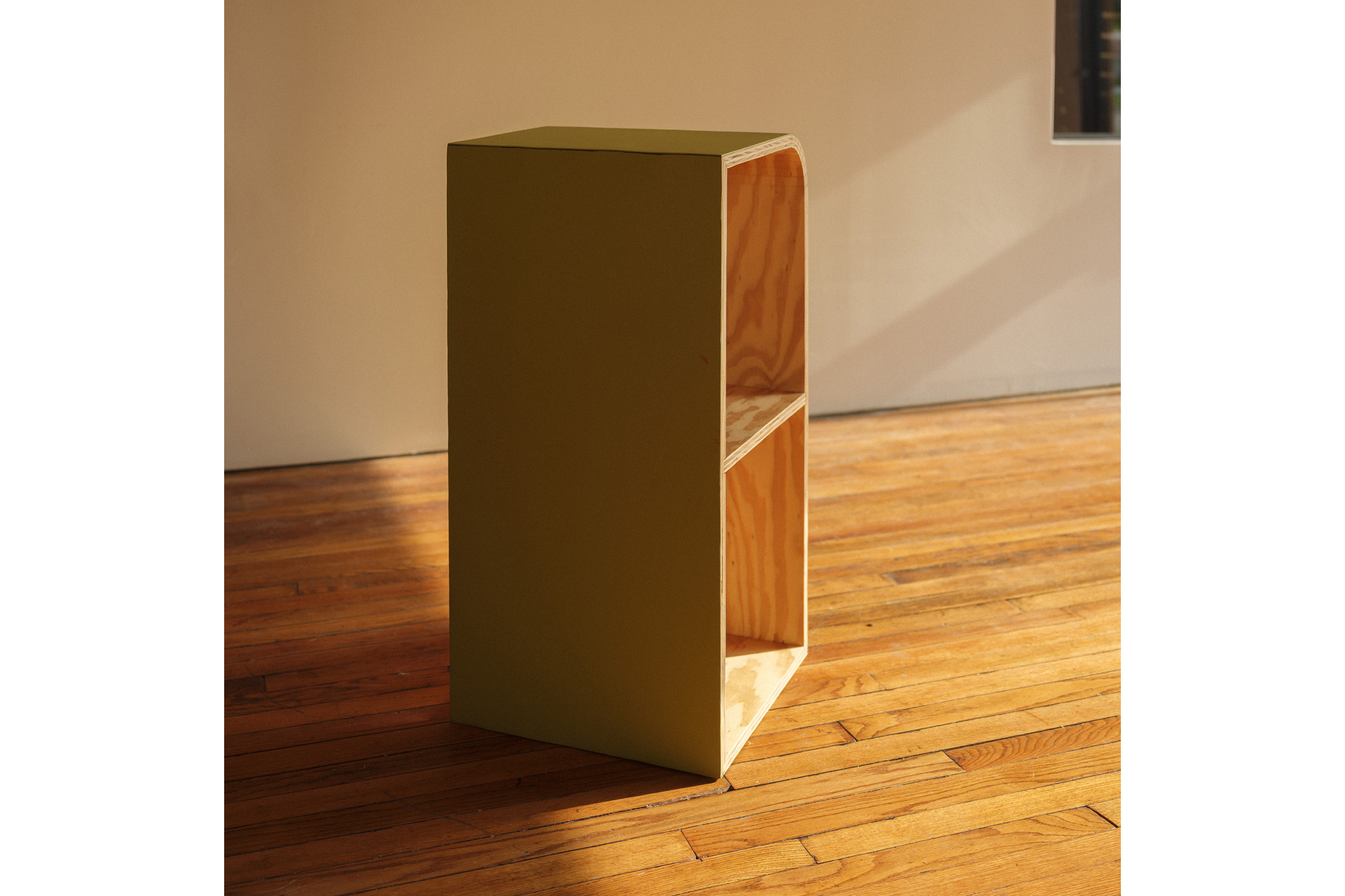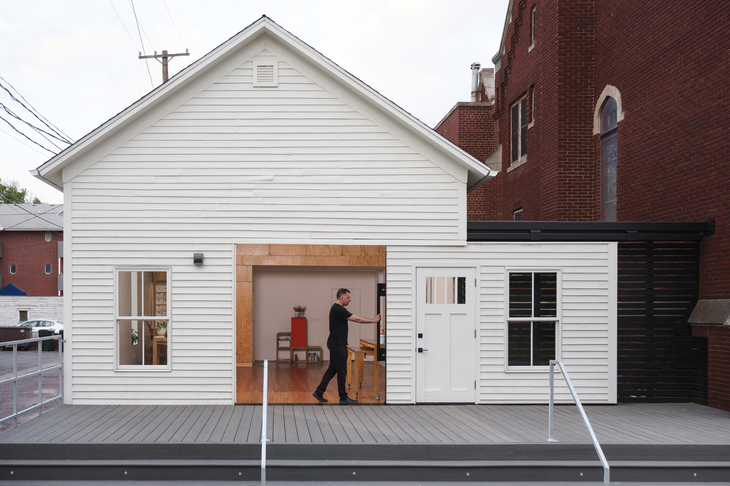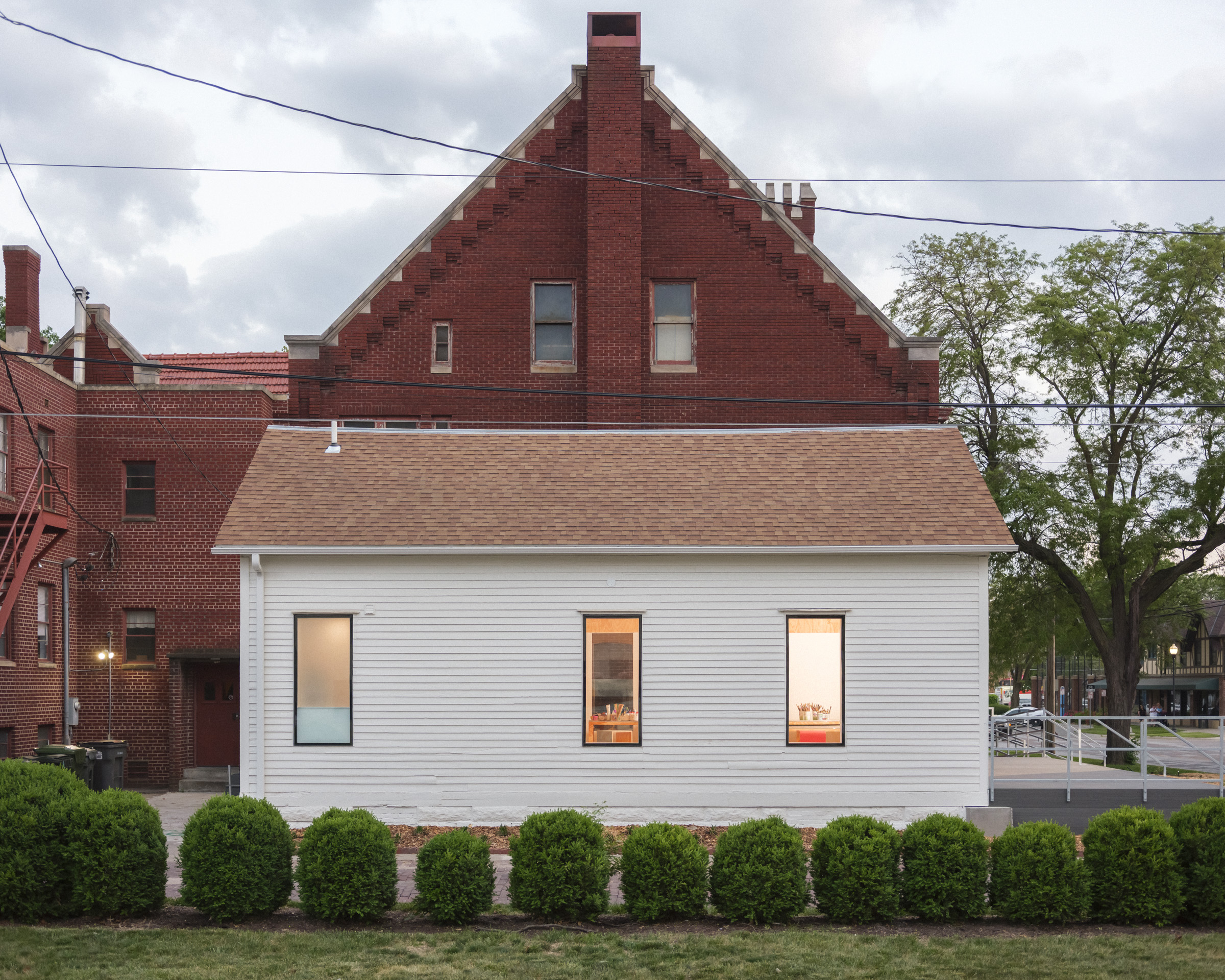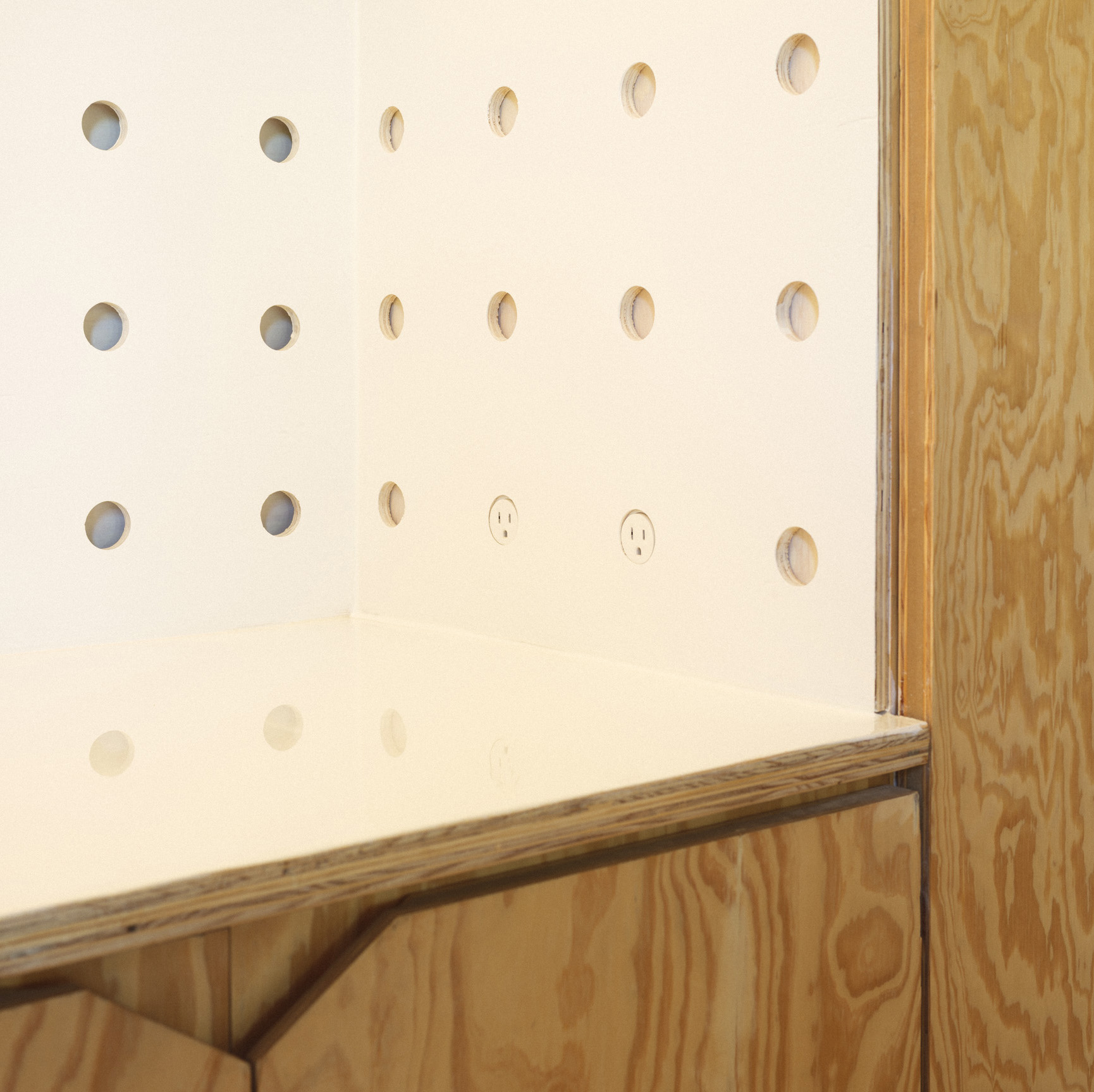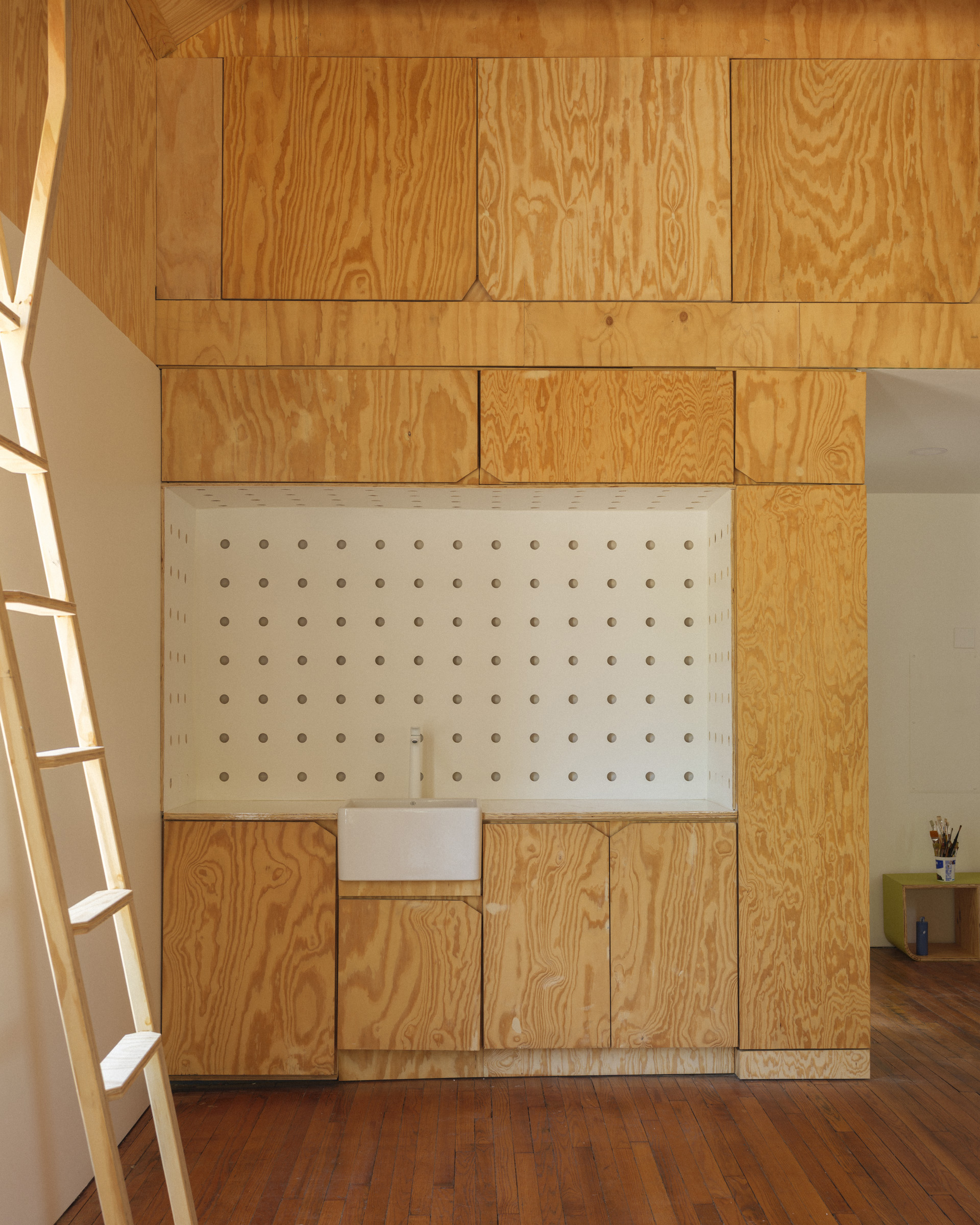 The most distinctive new feature is a large rolling wall that opens the Art Chapel to the community both literally and figuratively. The rolling wall is cut from the existing exterior wall preserving a door and window. The main interior space is a multi use room for art classes and exhibitions. At the back of this room is a new plywood wall that repeats the form of the open street elevation.