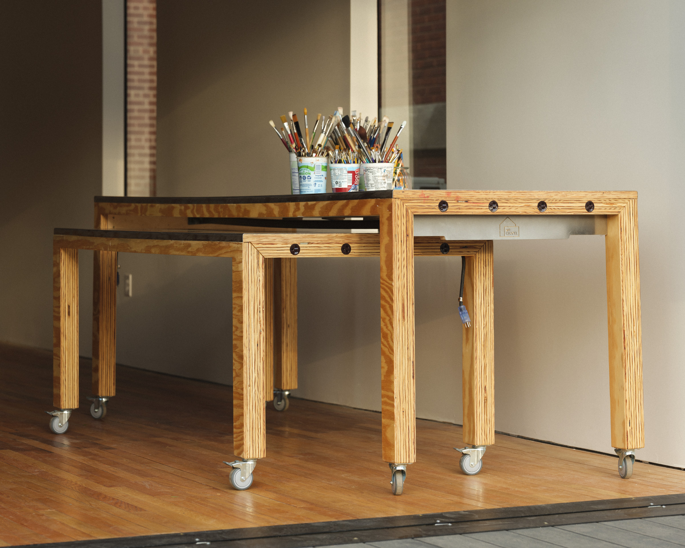 Custom ArTables: Tall and low tables nest when an open gallery space is desired. Each table has build in power outlets for art making equipment.